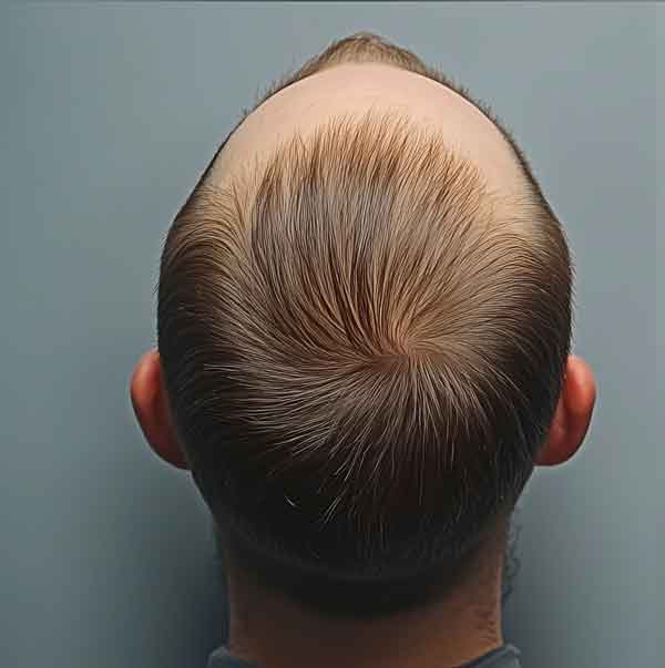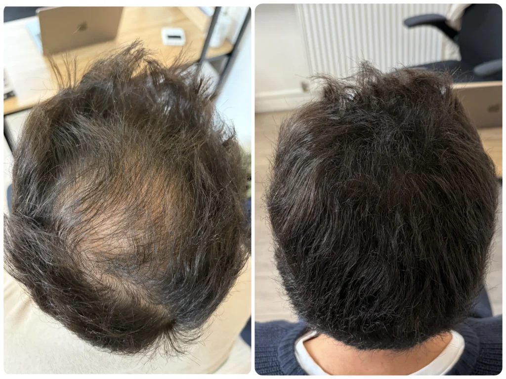 Correction plus visible sur l’avant ou le dessus du cuir chevelu.
